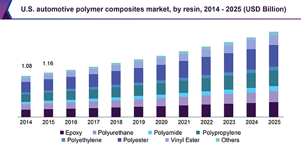 The global Automotive Polymer Composites Market size is expected to reach USD 11.6 billion by 2025, according to a new report by Grand View Research, Inc., exhibiting a CAGR of 6.8% during the forecast period. Polymer, metal, and ceramic matrix composites are key composites used in the automotive industry.