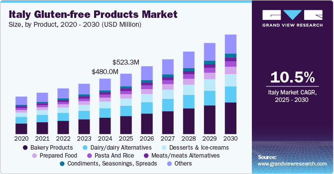 The Italy gluten-free products market size was estimated at USD 480.0 million in 2024 and is expected to grow at a CAGR of 10.5% from 2025 to 2030. The market for gluten-free products in Italy is experiencing significant growth due to a combination of health awareness, rising diagnoses of gluten-related disorders, and shifting consumer preferences. Traditionally known for its wheat-based cuisine, such as pasta, pizza, and bread, Italy has seen a noticeable increase in demand for gluten-free alternatives that allow individuals to enjoy their favorite foods without compromising their health.