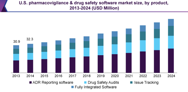 - By functionality, fully integrated software solutions for pharmacovigilance are anticipated to reach USD 25.35 million by 2024, at a CAGR of 7.0% from 2016 to 2024. The ADR reporting software segment, on the other hand, is projected to ascend at a CAGR of 6.4% over the forecast period