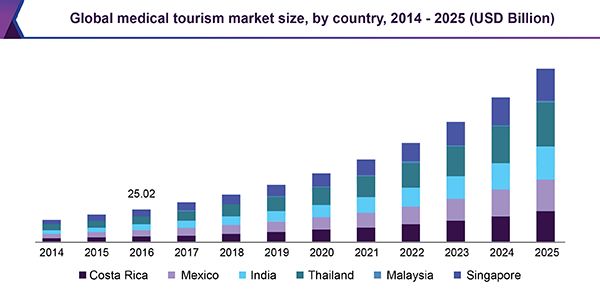 The global MEDICAL TOURISM MARKET size is expected to reach USD 131.35 billion by 2025, according to a new report by Grand View Research, Inc., expanding at a CAGR of 20.24% during the forecast period. Growing geriatric population coupled with improving the accessibility of high-quality and low-cost medical services/procedures are likely to augment the market during the forecast period.
